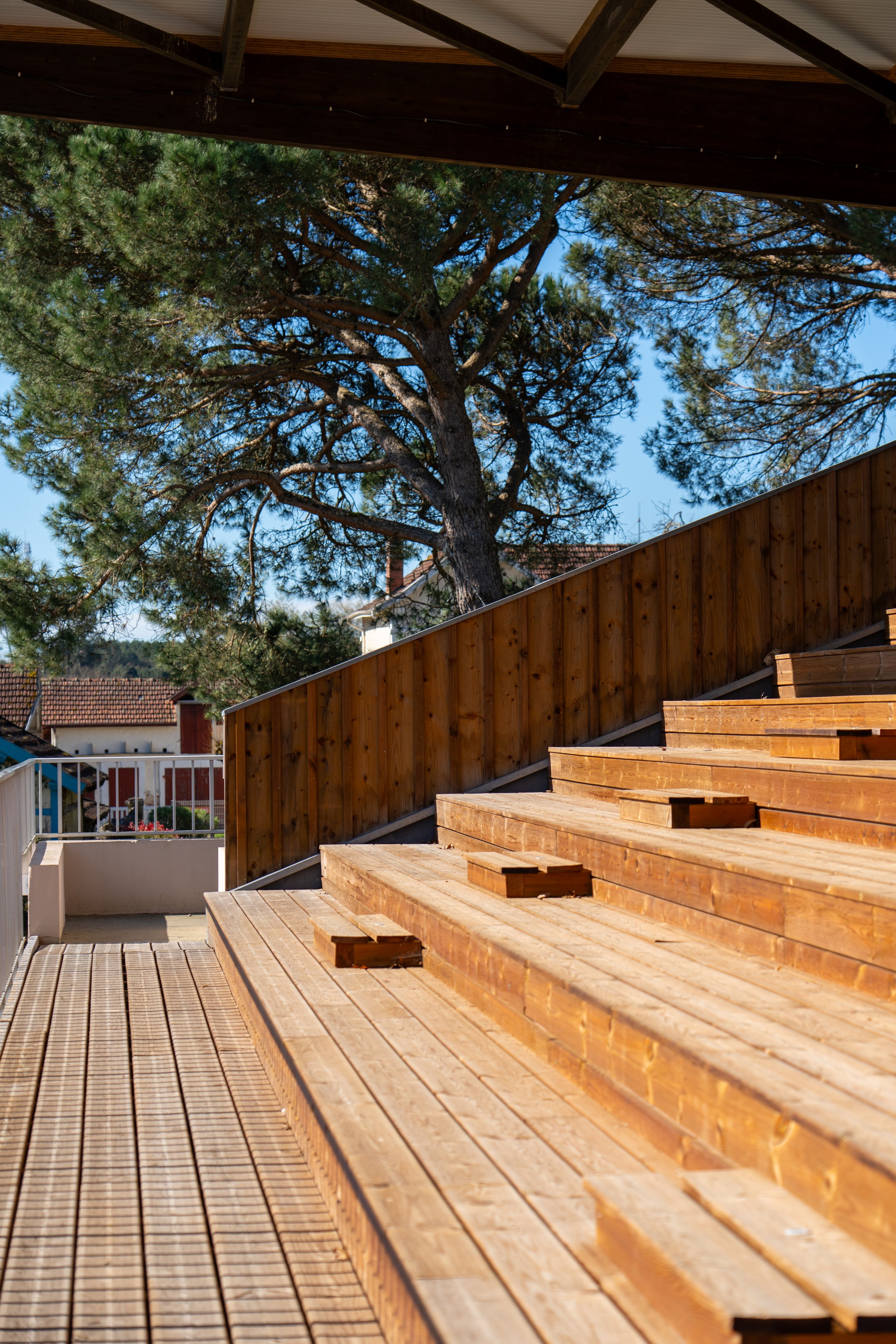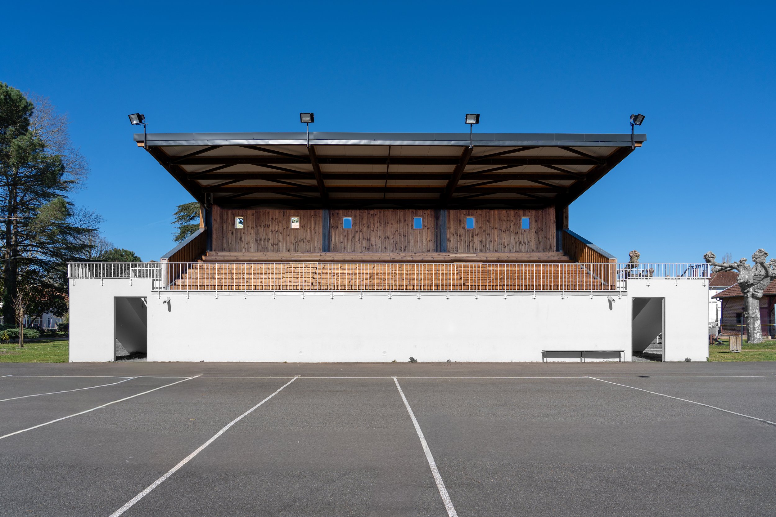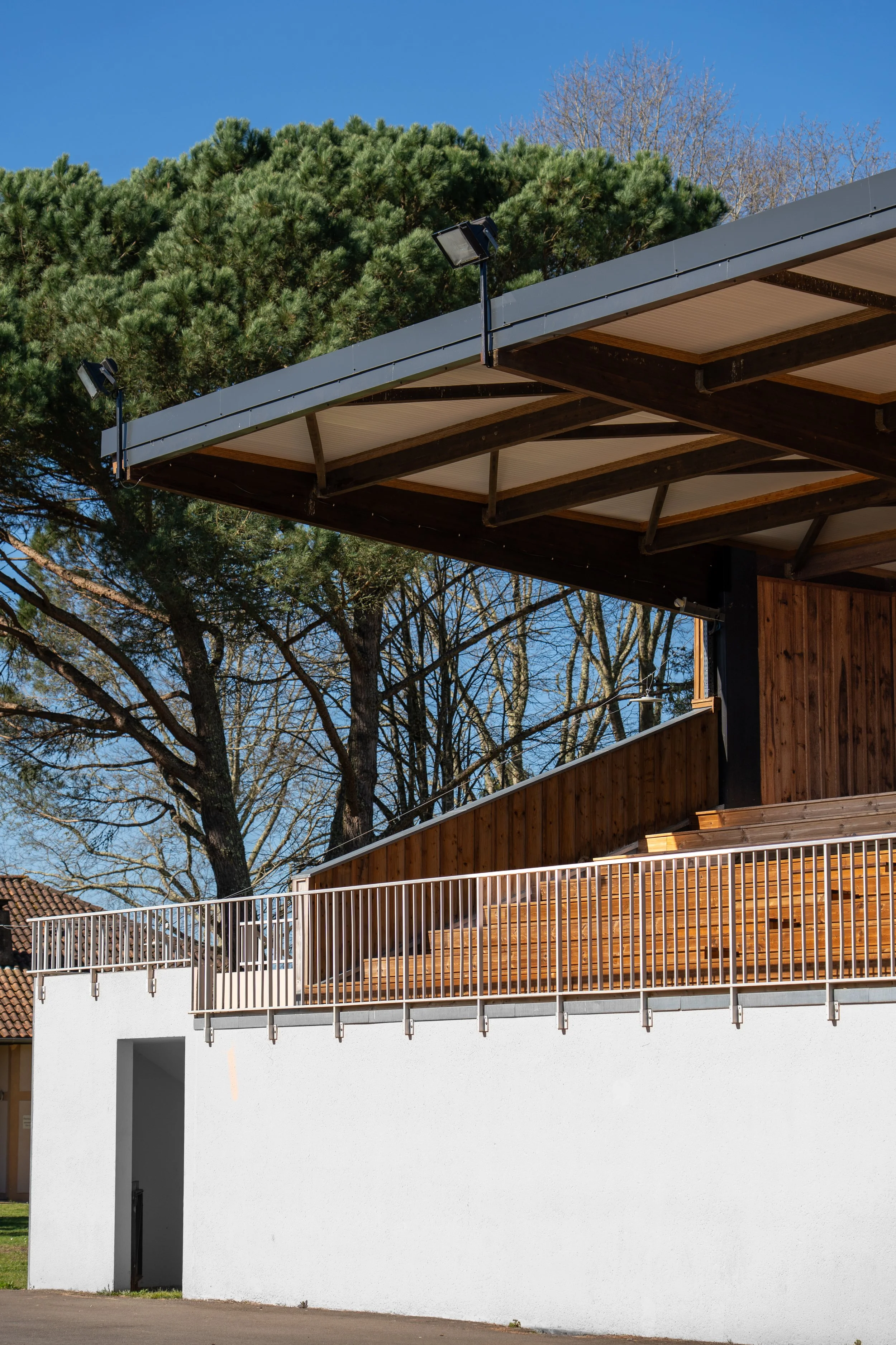 Les tribunes sont quant à elles réinterprétées avec un platelage et des gradins en bois massif, apportant chaleur, simplicité et cohérence à l’ensemble.