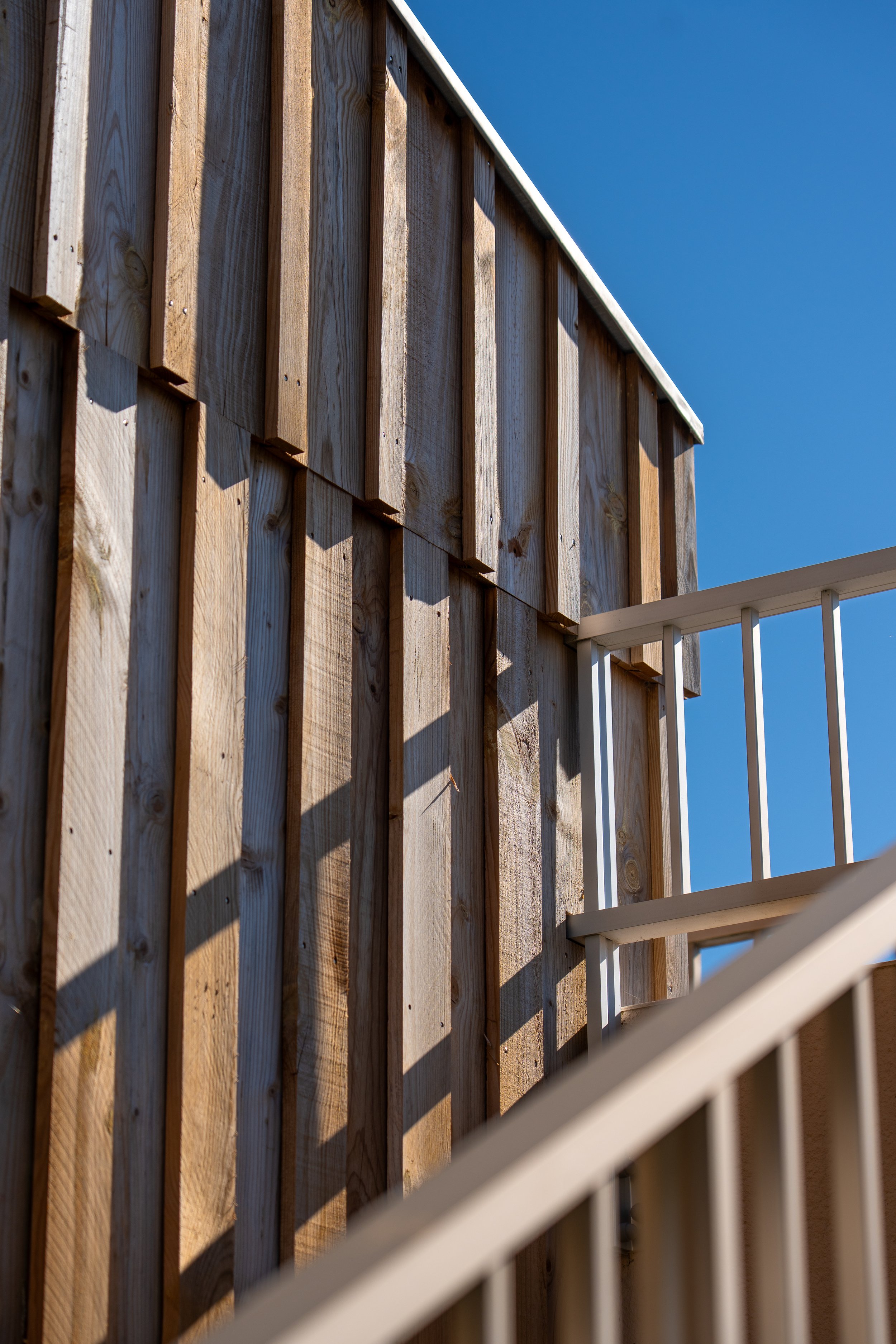 À l’origine, le bâtiment présentait un soubassement en garluche apparente sur trois façades, surmonté d’un bardage bois vieilli et de menuiseries triangulaires en bois, aujourd’hui fortement dégradés. La structure principale en lamellé-collé présentait également des désordres importants, rendant nécessaire une intervention à la fois technique et architecturale. Les tribunes, les protections de façade ajoutées au fil du temps, ainsi que plusieurs éléments de couverture et d’enveloppe étaient eux aussi dans un état de vétusté avancé.