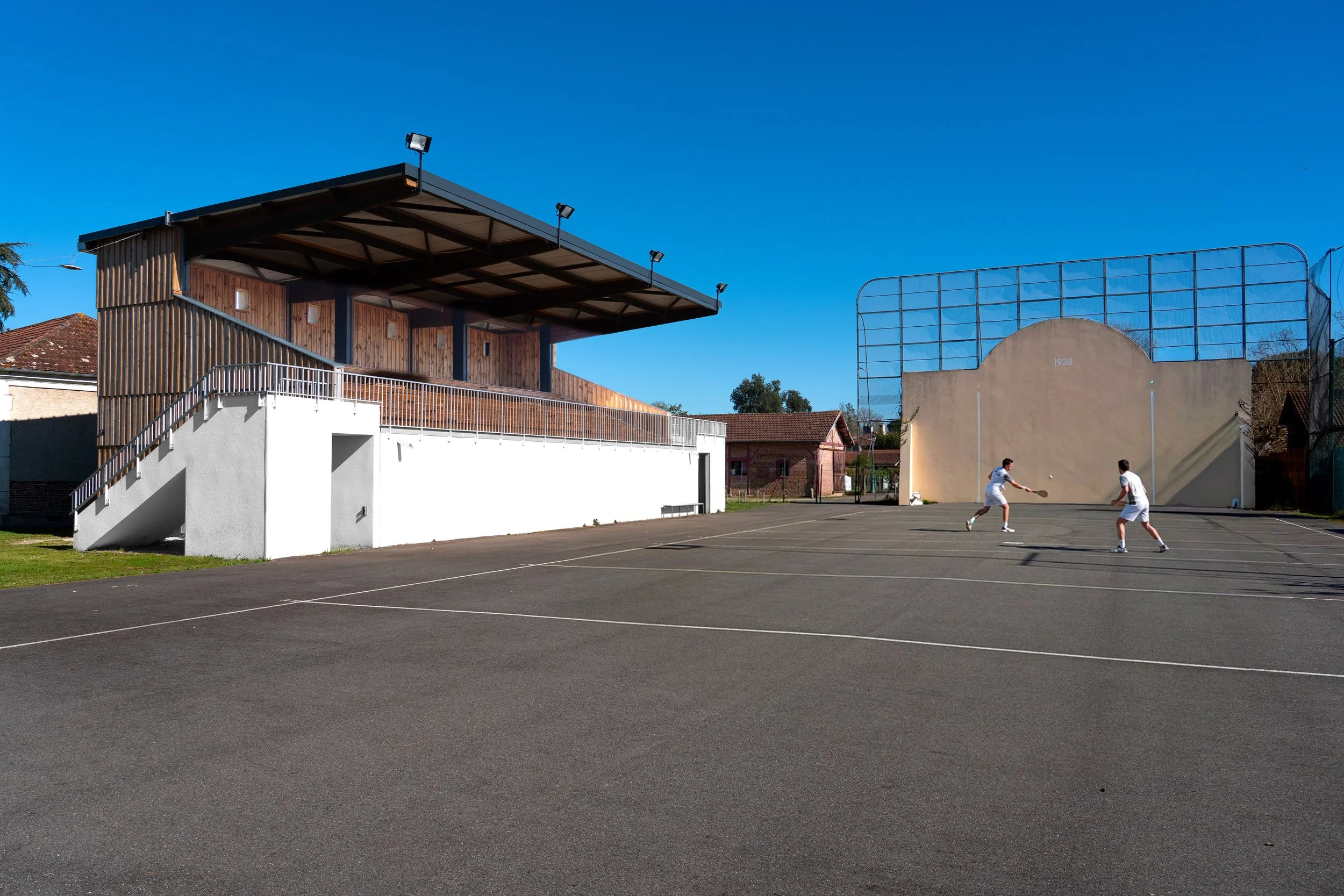 en niveau à l'air libre, accessible par deux volées d'escalier, 270 places en gradins d'une surface de 134 m² donnant sur une aire de sport et mur de fronton de pelote basque.