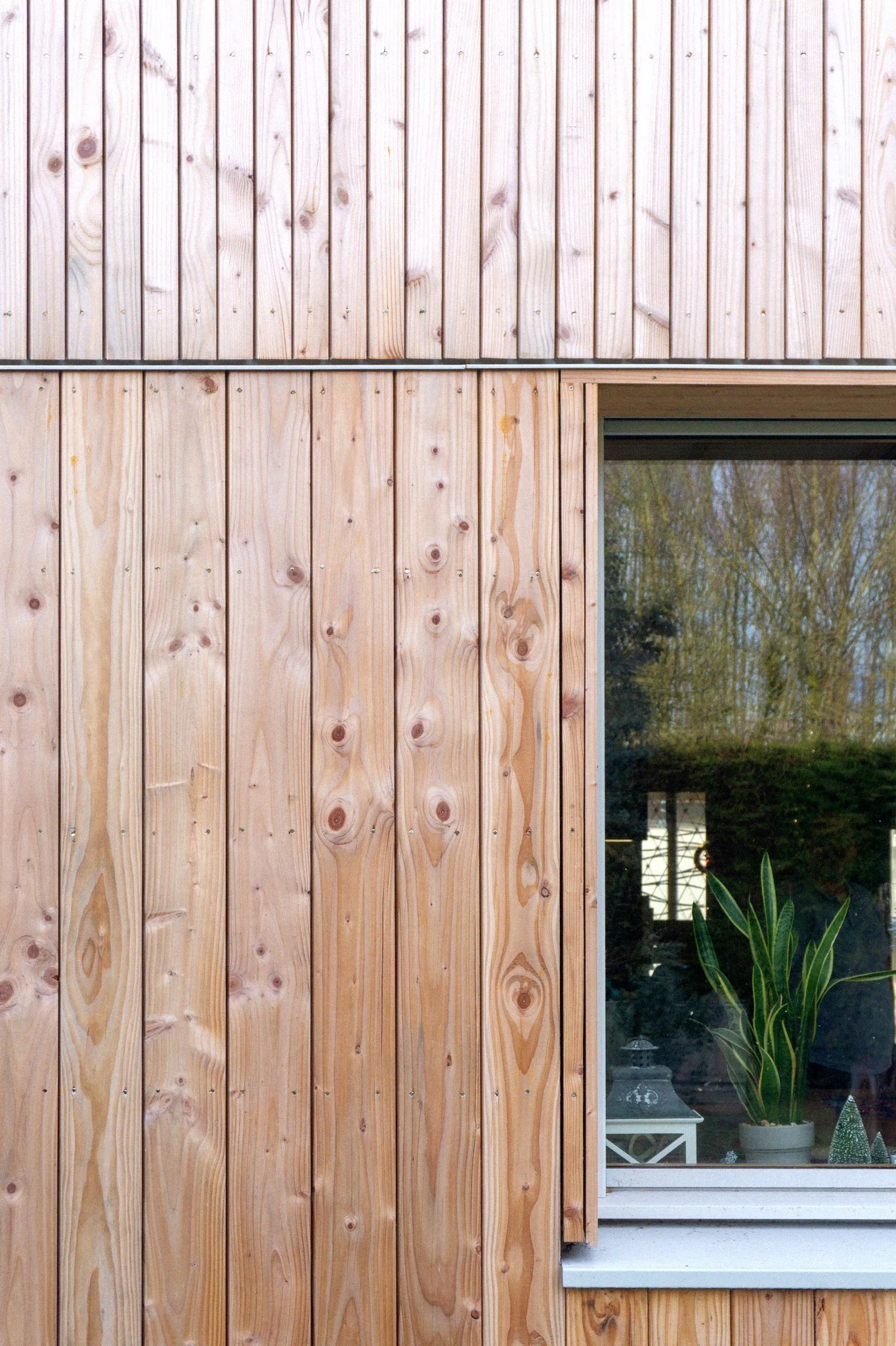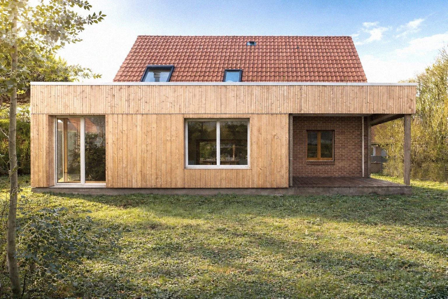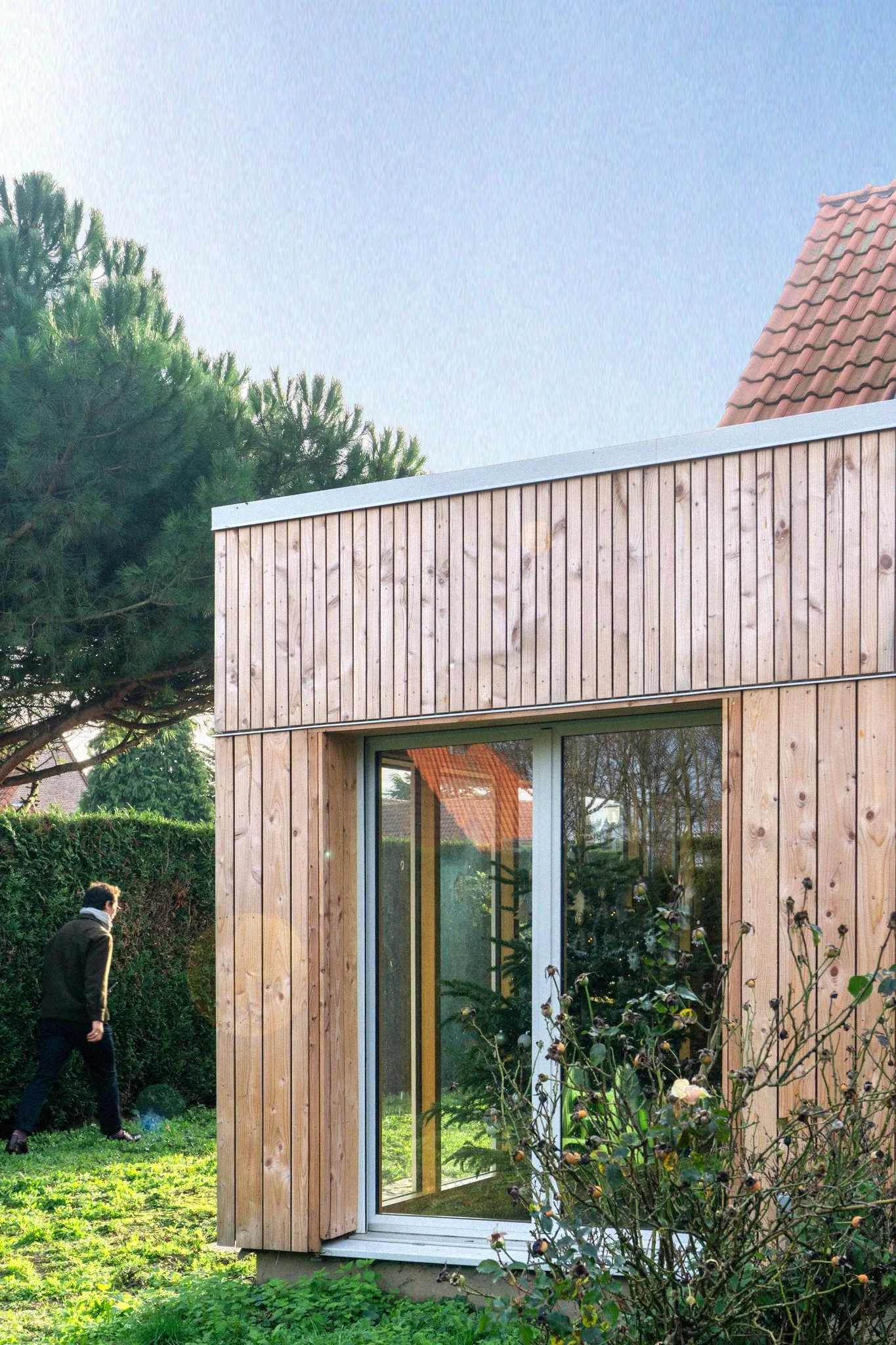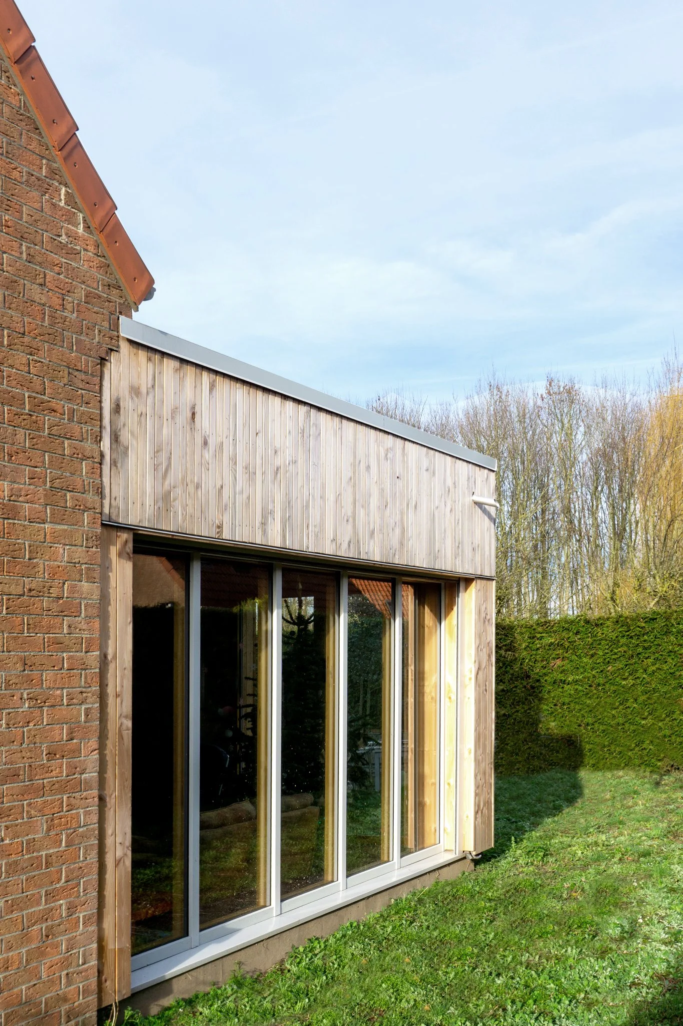 L’extension se développe de plein pied et se raccorde à la maison existante côté façade nord, sa forme est rectangulaire, elle abrite une surface de 28 m² de cuisine et salon. Le système constructif de l’extension est composé de murs à ossature bois formant enceinte, avec isolation en laine de bois entre montants avec complément d’isolation en fibre de bois. Le tout repose sur une dalle béton. Le bardage de façade est constitué d’un bardage verticale qui se ressert en partie haute d’affirmer l’horizontalité du bandeau.